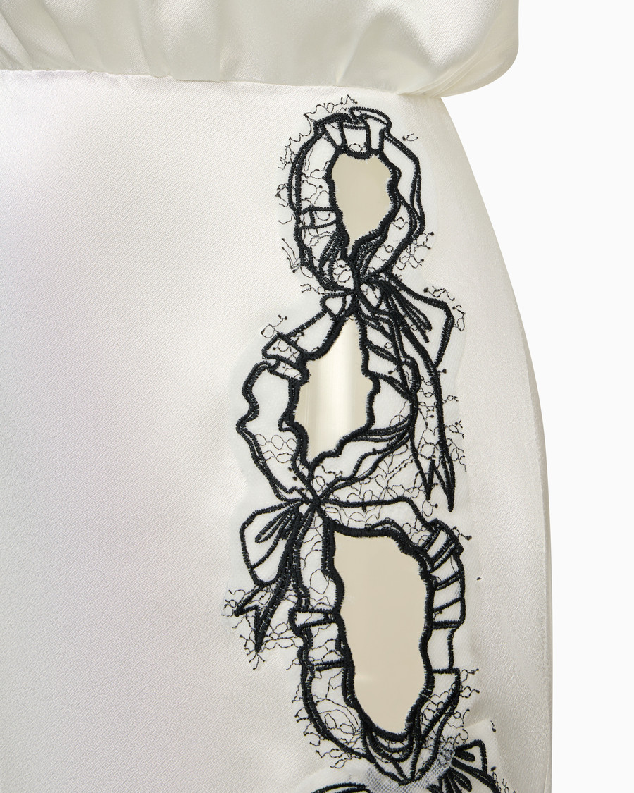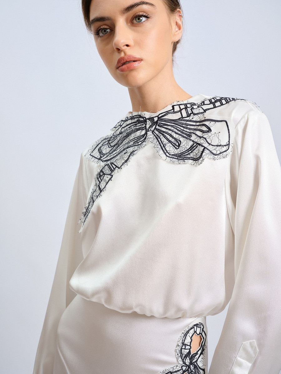 Это платье — симфония, где каждая деталь продумана до мелочей. Бант, грациозно огибающий линию выреза, подчеркивает линии шеи и ключиц, добавляя образу нотку романтичной загадочности.