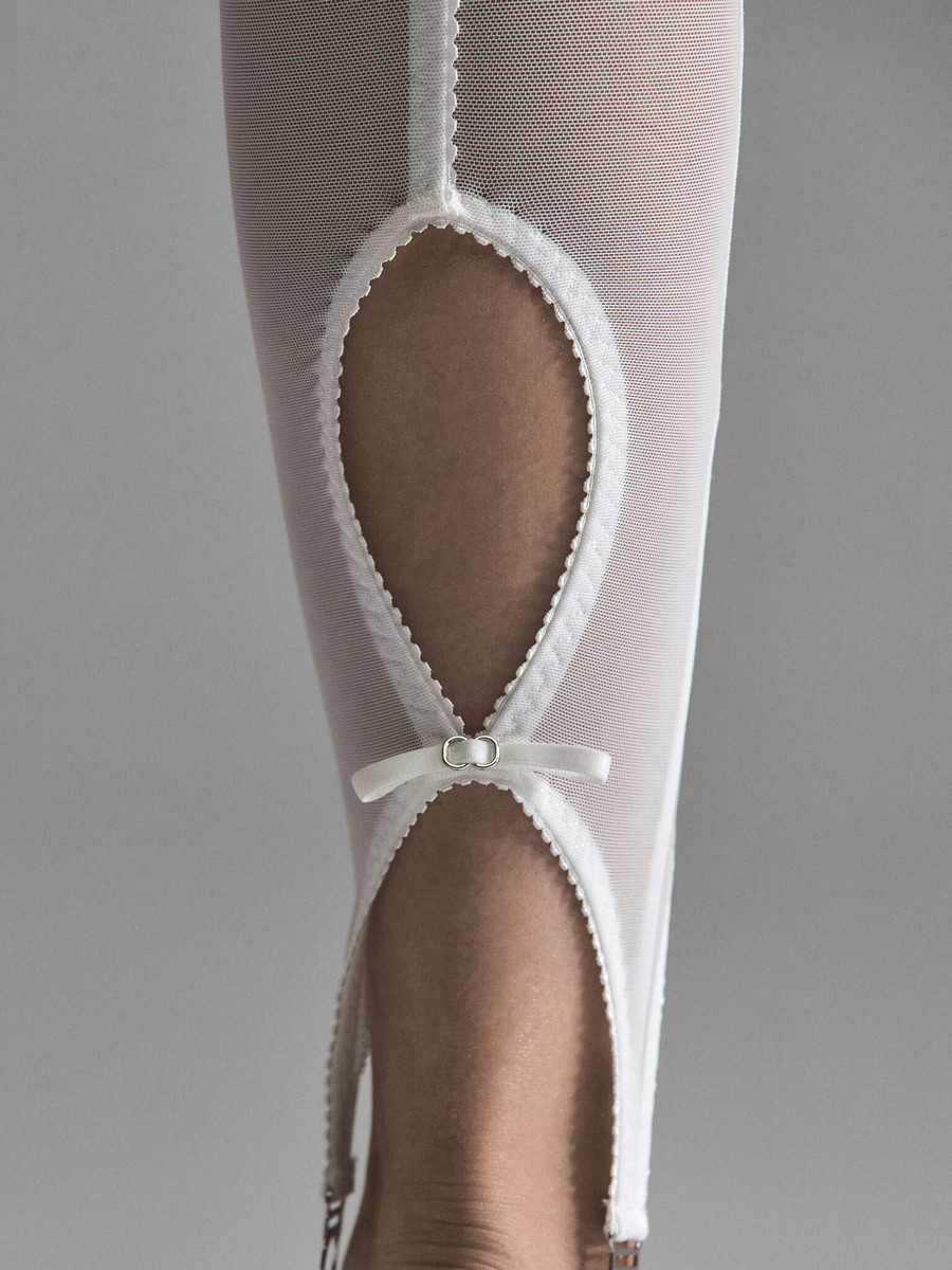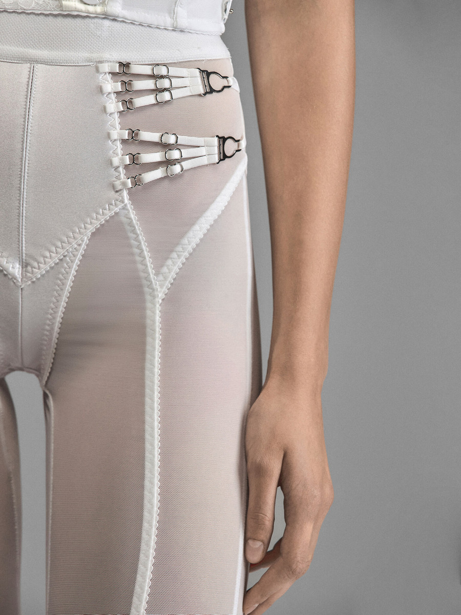 Леггинсы со штрипками из плотной полупрозрачной сетки с атласными вставками, провоцирующими на взгляды. Стрелки по передней части изделия моделируют бельевые элементы и создают правильные линии, удлиняющие ноги. Атласный пояс огибает талию, стягивая ее до эстетического оргазма. Декоративные бретели на бедрах отвечают за тот самый "надрыв", который вынуждает сердца биться чаще.