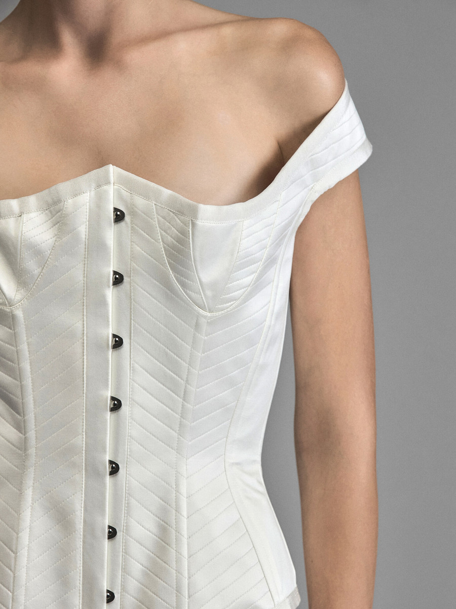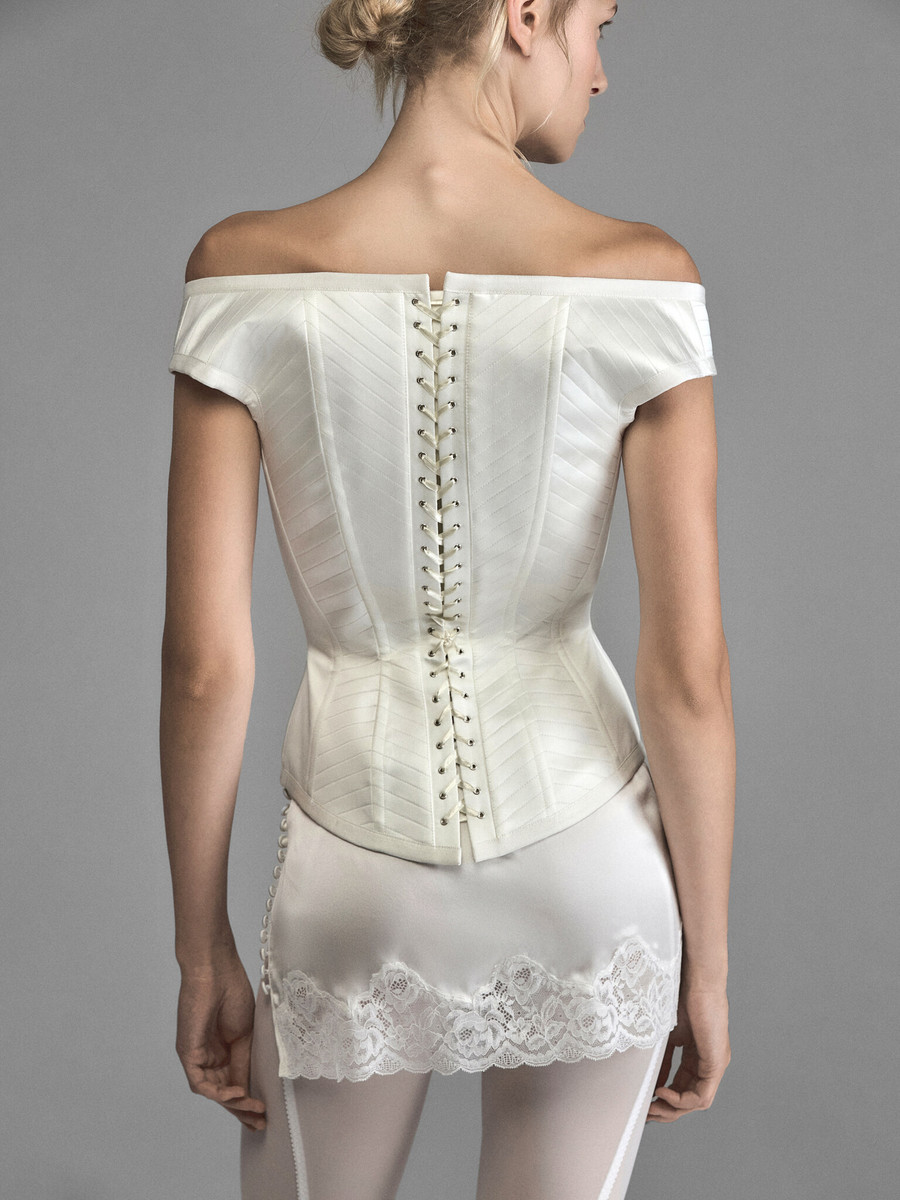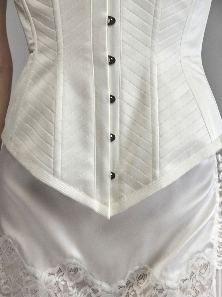 Корсет создан по оригинальным историческим лекалам 19 века: формодержащие металлические кости, бюск, брутальные отстрочки на нежной ткани. Частая шнуровка сзади позволяет затянуть изделие сверху и снизу, создавая невероятный силуэт. Сатин пудрового цвета выбран для внутренней отделки корсета.